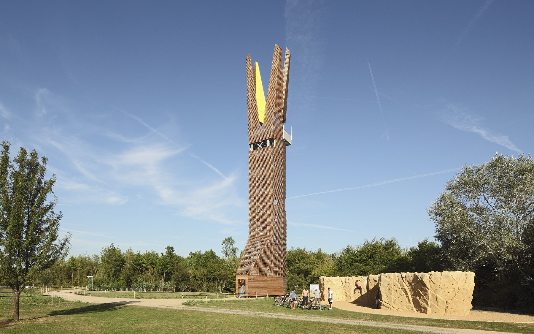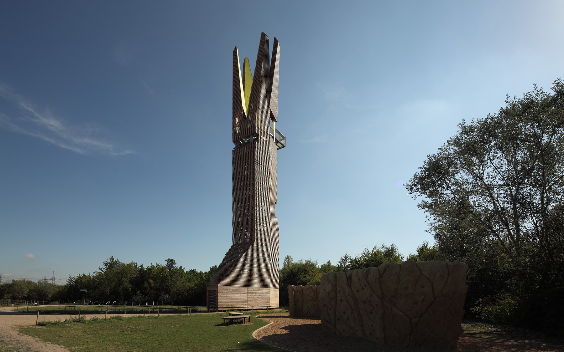 In addition to its function as a vantage point, the structure also has the express purpose of being a landmark that is easily recognisable from afar as a reference to the ensemble of nature conservation centre and visitor centre at the Weilbacher Kiesgruben regional park portal.in the largely flat landscape on the outskirts of residential areas, the tower is intended to be a landmark and symbol for the ideas associated with the RhineMain regional park.the overall shape of the observation tower is designed as a large figure that suggests associations and interpretations in the field of natural forms, but without being an oversized plant or animal sculpture. The aim of the design is to keep the possible images in the viewer's imagination so open that various interpretations are possible, for example that of a bud, that of flower petals or similar.